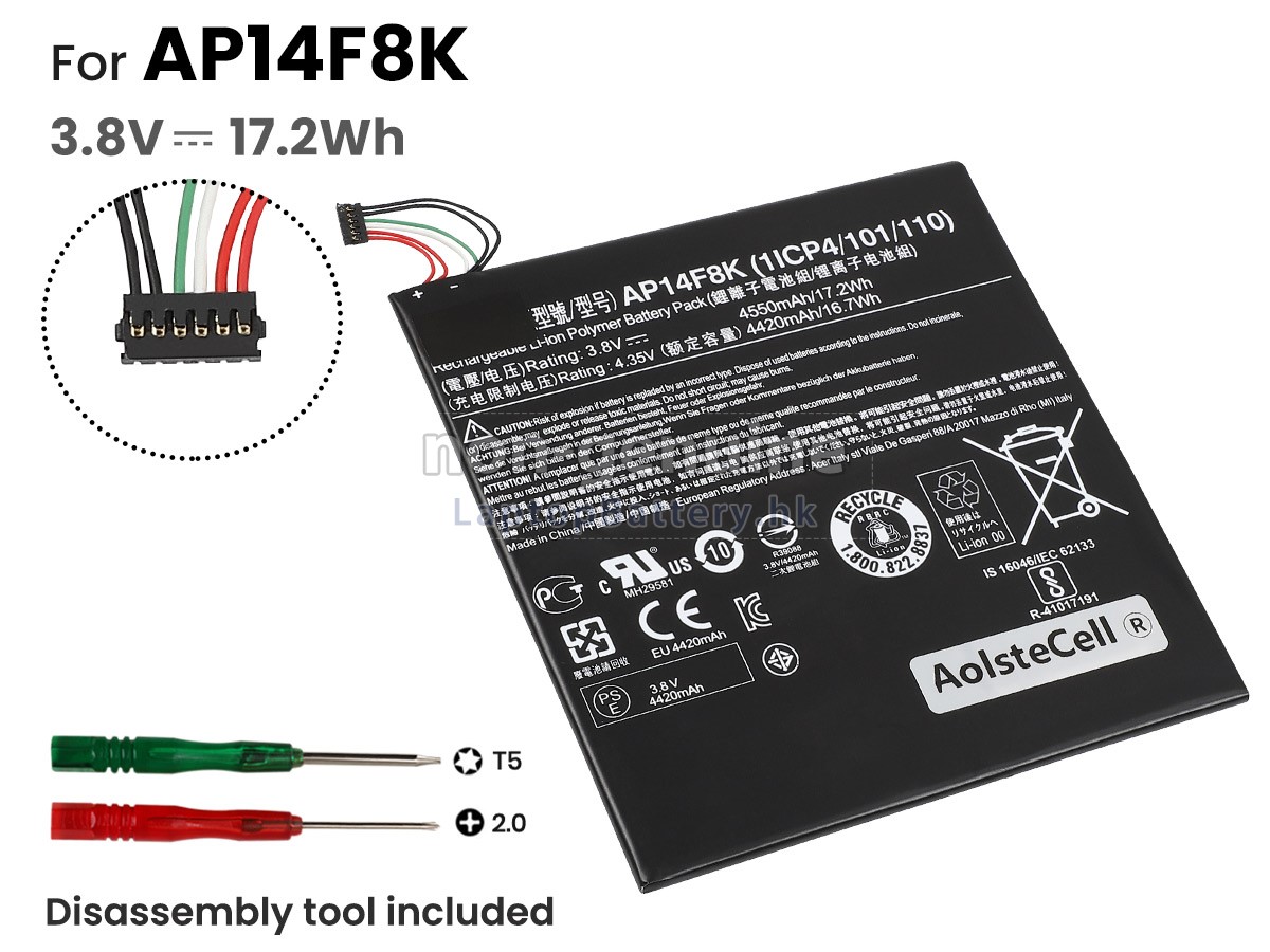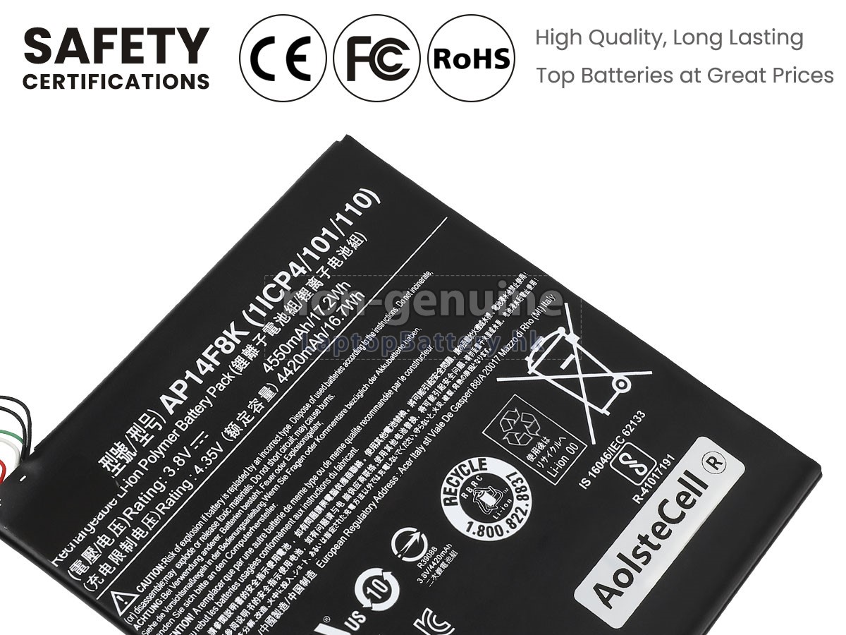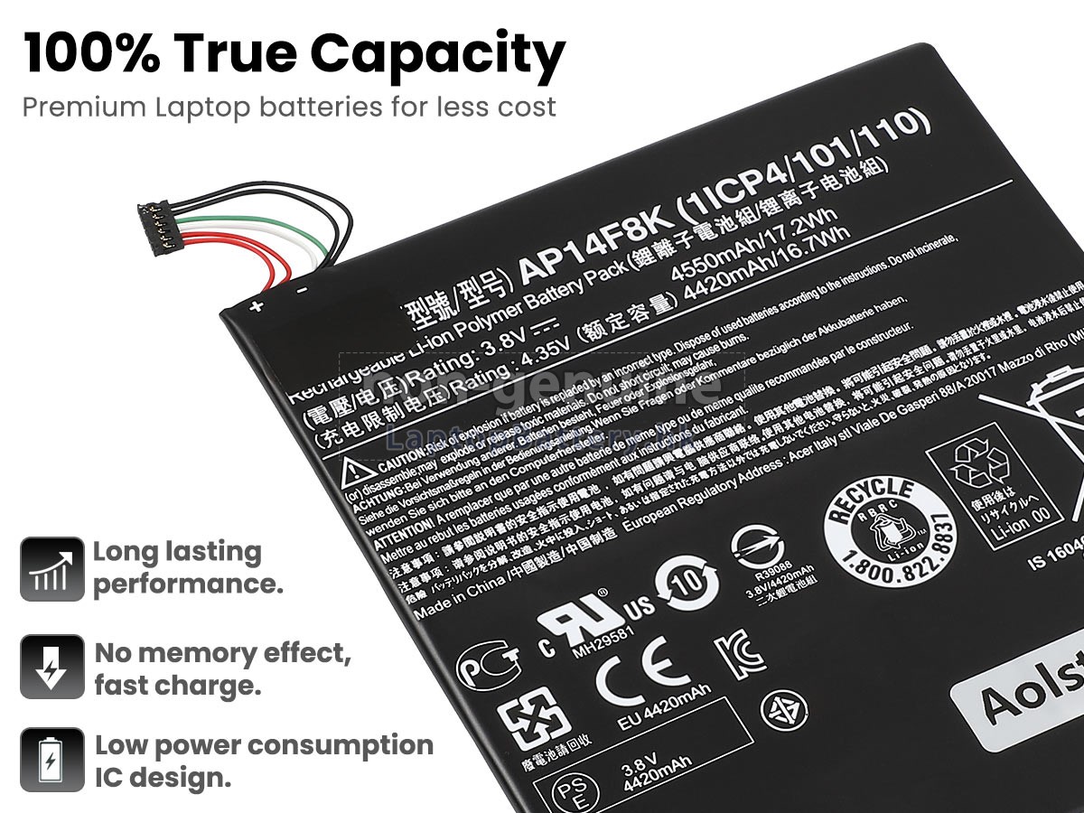 這款全新的ACER宏碁AP14F8K(1ICP4/101/110)替代電池採用三星,松下和LG等原廠高品質鋰離子電芯製成,電池的外殼由不易燃且耐用的塑料製成。我們對安全有著十分嚴格的要求,每一塊出自於LaptopBattery.hk的ACER宏碁AP14F8K(1ICP4/101/110)電池均經過嚴格檢驗,通過了HKSI,CE,UL,ROHS,ISO 9001 / 9002等一系列安全認證,符合國際標準,與原始製造商規格100%兼容,性能上可以匹配甚至超過原裝AP14F8K(1ICP4/101/110)電池。此款ACER宏碁AP14F8K(1ICP4/101/110)電池的充放電週期在600次左右,會為您帶來極佳的續航體驗。