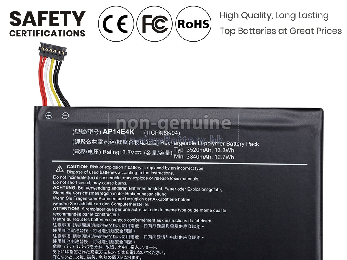 這款全新的ACER宏碁Iconia One 7 B1-750(NT.L85EE.006)替代電池採用三星,松下和LG等原廠高品質鋰離子電芯製成,電池的外殼由不易燃且耐用的塑料製成。我們對安全有著十分嚴格的要求,每一塊出自於LaptopBattery.hk的ACER宏碁Iconia One 7 B1-750(NT.L85EE.006)電池均經過嚴格檢驗,通過了HKSI,CE,UL,ROHS,ISO 9001 / 9002等一系列安全認證,符合國際標準,與原始製造商規格100%兼容,性能上可以匹配甚至超過原裝Iconia One 7 B1-750(NT.L85EE.006)電池。此款ACER宏碁Iconia One 7 B1-750(NT.L85EE.006)電池的充放電週期在600次左右,會為您帶來極佳的續航體驗。