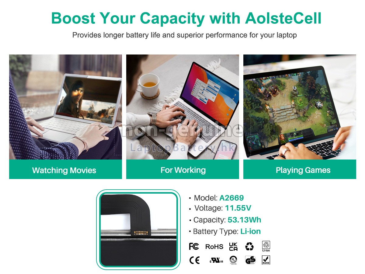這款全新的APPLE蘋果MacBook Air M2 2022 MLY33LL/A替代電池採用三星,松下和LG等原廠高品質鋰離子電芯製成,電池的外殼由不易燃且耐用的塑料製成。我們對安全有著十分嚴格的要求,每一塊出自於LaptopBattery.hk的APPLE蘋果MacBook Air M2 2022 MLY33LL/A電池均經過嚴格檢驗,通過了HKSI,CE,UL,ROHS,ISO 9001 / 9002等一系列安全認證,符合國際標準,與原始製造商規格100%兼容,性能上可以匹配甚至超過原裝MacBook Air M2 2022 MLY33LL/A電池。此款APPLE蘋果MacBook Air M2 2022 MLY33LL/A電池的充放電週期在600次左右,會為您帶來極佳的續航體驗。