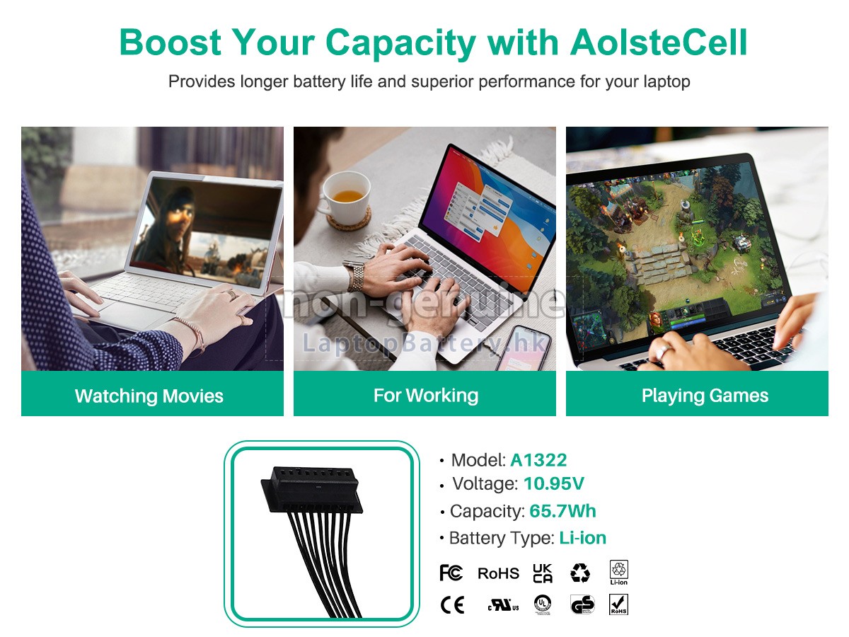 這款全新的APPLE蘋果MacBook Pro 13" MB990LL/A替代電池採用三星,松下和LG等原廠高品質鋰離子電芯製成,電池的外殼由不易燃且耐用的塑料製成。我們對安全有著十分嚴格的要求,每一塊出自於LaptopBattery.hk的APPLE蘋果MacBook Pro 13" MB990LL/A電池均經過嚴格檢驗,通過了HKSI,CE,UL,ROHS,ISO 9001 / 9002等一系列安全認證,符合國際標準,與原始製造商規格100%兼容,性能上可以匹配甚至超過原裝MacBook Pro 13" MB990LL/A電池。此款APPLE蘋果MacBook Pro 13" MB990LL/A電池的充放電週期在600次左右,會為您帶來極佳的續航體驗。