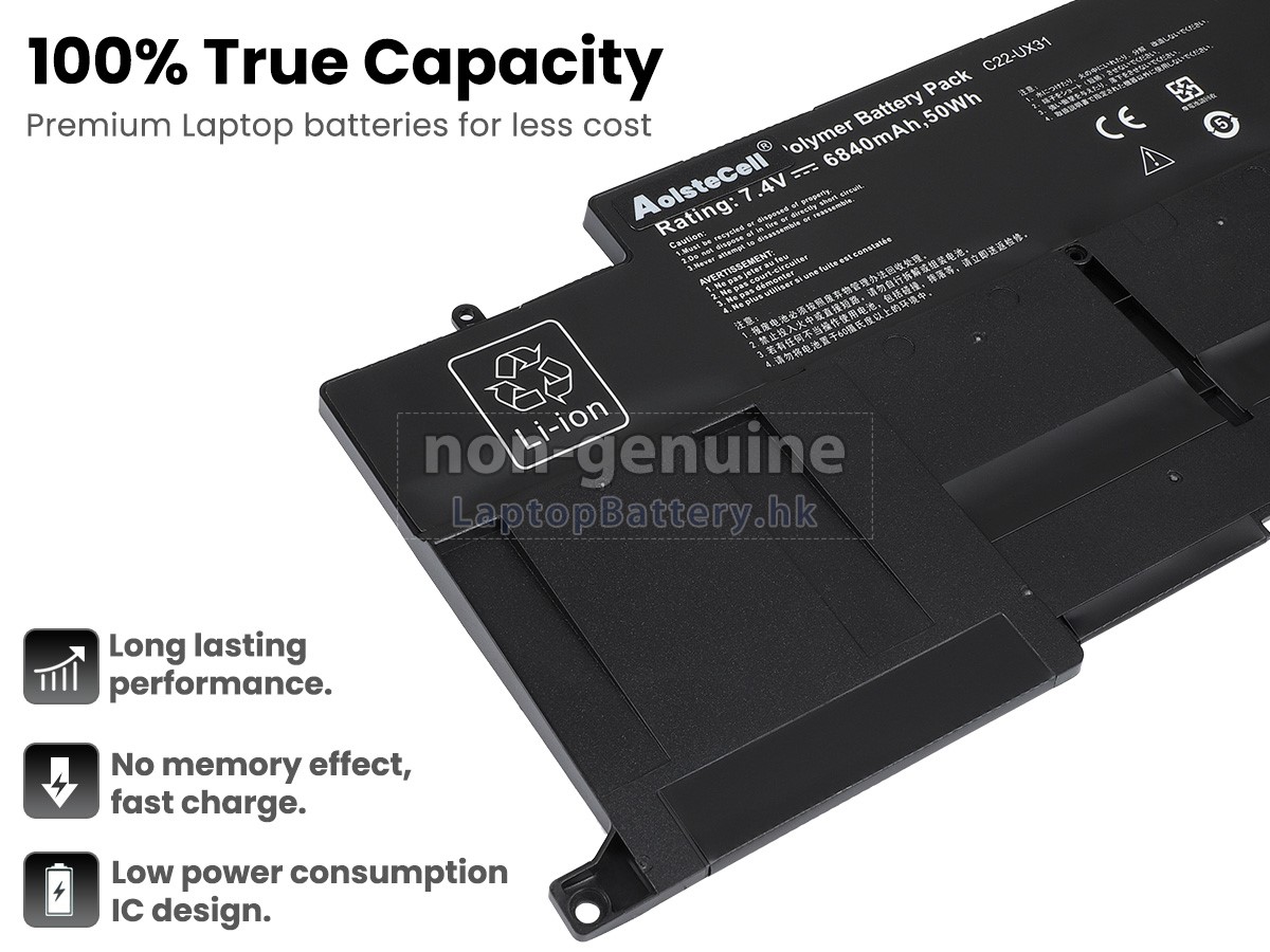 這款全新的ASUS華碩0B200-00020100替代電池採用三星,松下和LG等原廠高品質鋰離子電芯製成,電池的外殼由不易燃且耐用的塑料製成。我們對安全有著十分嚴格的要求,每一塊出自於LaptopBattery.hk的ASUS華碩0B200-00020100電池均經過嚴格檢驗,通過了HKSI,CE,UL,ROHS,ISO 9001 / 9002等一系列安全認證,符合國際標準,與原始製造商規格100%兼容,性能上可以匹配甚至超過原裝0B200-00020100電池。此款ASUS華碩0B200-00020100電池的充放電週期在600次左右,會為您帶來極佳的續航體驗。