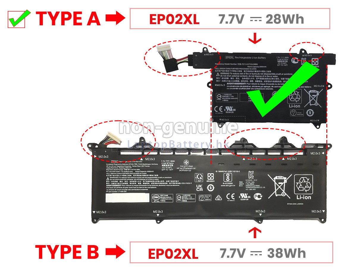 Battery EP02XL has two styles, their appearance, size, capacity are not the same compatible use, according to the primary battery purchase. 高品質HP惠普EPO2028XL-PL替代電池 (38Wh,2芯)