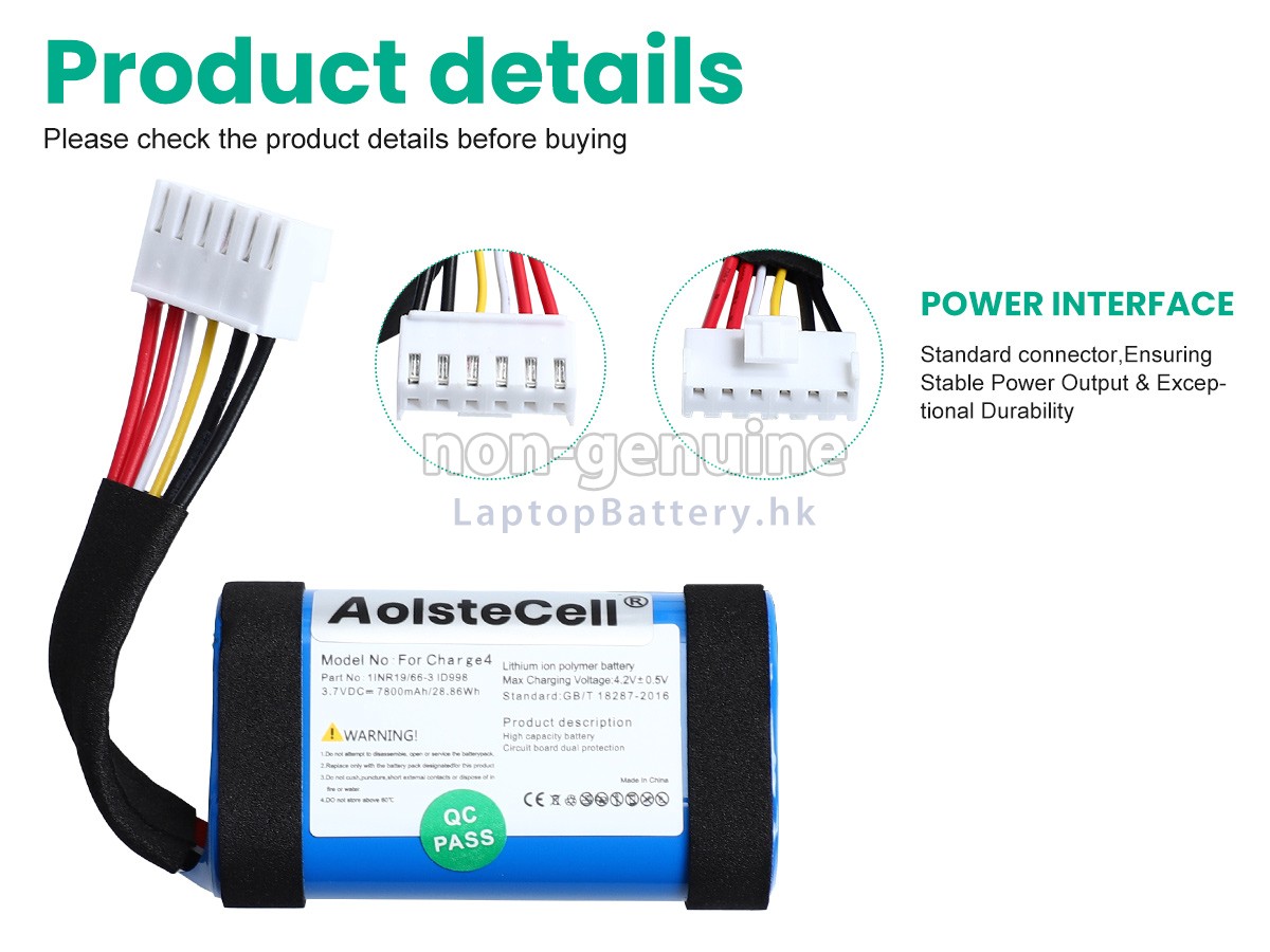 2 對比您原先的JBL CHARGE4WHTAM揚聲器電池的電壓和容量是否與我們的一致,然後再查看我們的產品大圖,看接口、大致形狀是否相同。