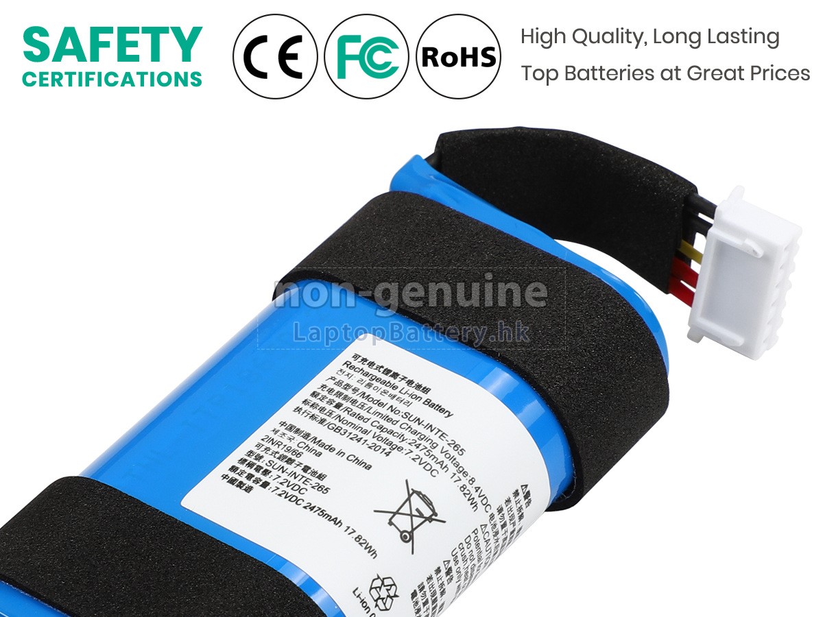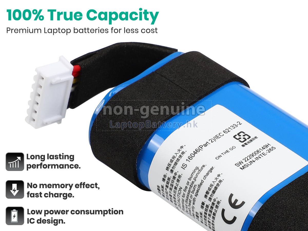 這款全新的JBL PARTYBOX ON THE GO揚聲器替代電池採用三星,松下和LG等原廠高品質鋰離子電芯製成,電池的外殼由不易燃且耐用的塑料製成。我們對安全有著十分嚴格的要求,每一塊出自於LaptopBattery.hk的JBL PARTYBOX ON THE GO音箱電池均經過嚴格檢驗,通過了HKSI,CE,UL,ROHS,ISO 9001 / 9002等一系列安全認證,符合國際標準,與原始製造商規格100%兼容,性能上可以匹配甚至超過原裝PARTYBOX ON THE GO電池。此款JBL PARTYBOX ON THE GO電池的充放電週期在600次左右,會為您帶來極佳的續航體驗。