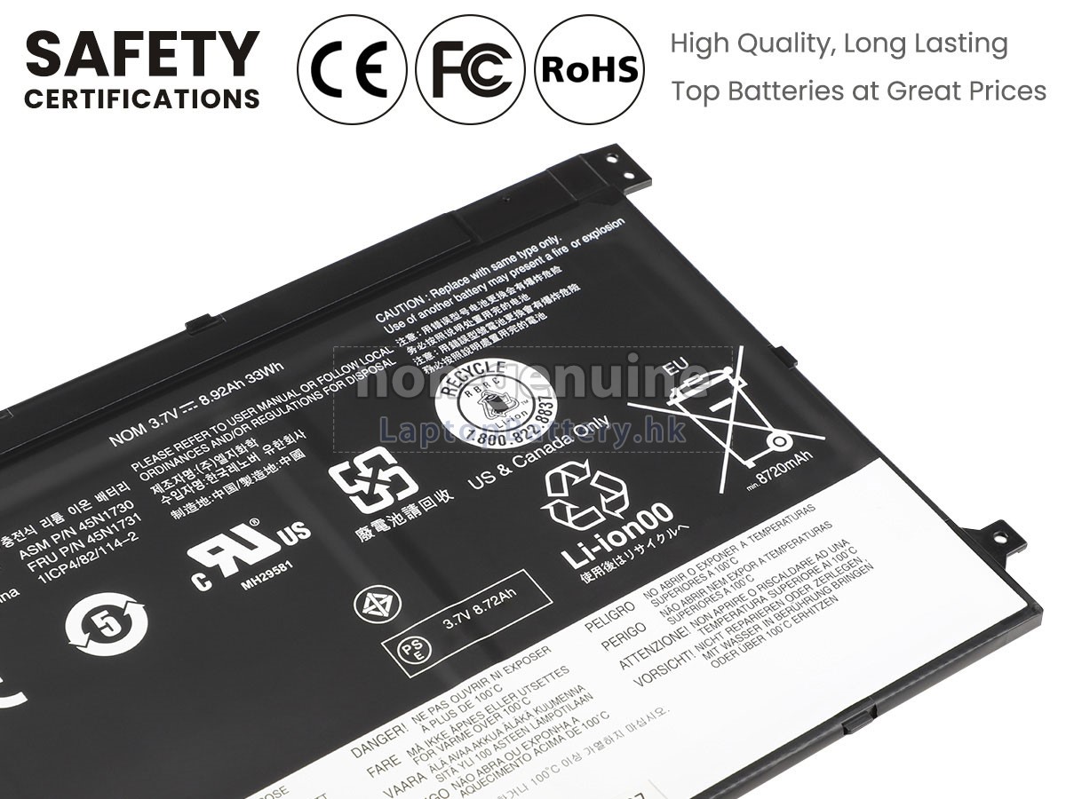 這款全新的LENOVO聯想45N1729替代電池採用三星,松下和LG等原廠高品質鋰離子電芯製成,電池的外殼由不易燃且耐用的塑料製成。我們對安全有著十分嚴格的要求,每一塊出自於LaptopBattery.hk的LENOVO聯想45N1729電池均經過嚴格檢驗,通過了HKSI,CE,UL,ROHS,ISO 9001 / 9002等一系列安全認證,符合國際標準,與原始製造商規格100%兼容,性能上可以匹配甚至超過原裝45N1729電池。此款LENOVO聯想45N1729電池的充放電週期在600次左右,會為您帶來極佳的續航體驗。