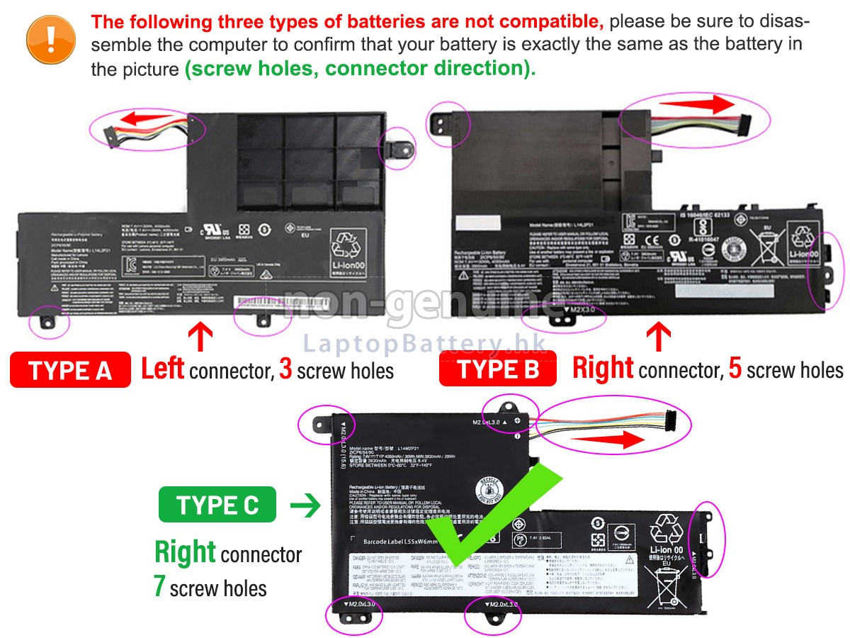 Before placing an order, please open your laptop to check your old battery at first,ensure the screws and connector position is same to our battery. 高品質LENOVO聯想IdeaPad 510S-14ISK(80TK003KGE)替代電池 (30Wh,4芯)