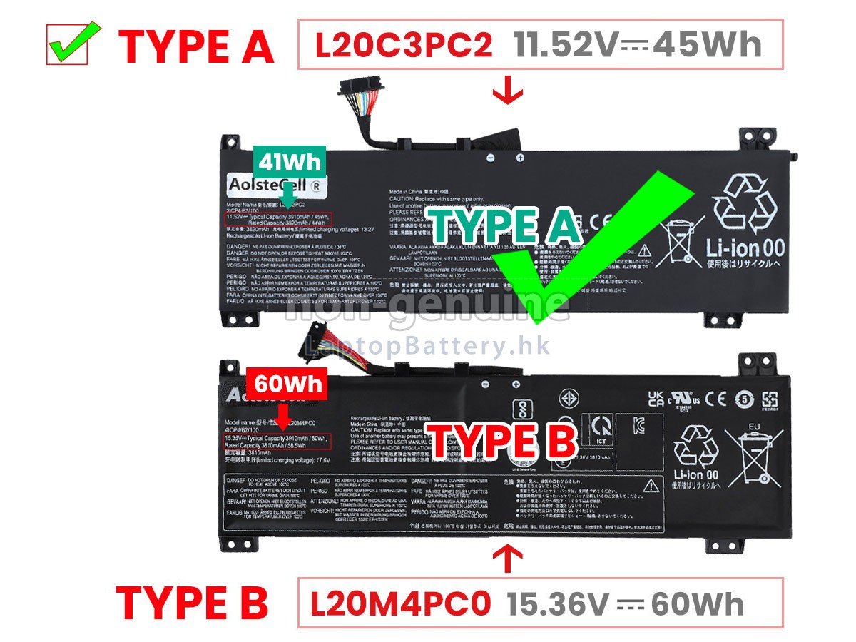 There are 2 types battery, before placing an order please check your old battery first, ensure order one correct battery for your laptop. This battery is not compatible with 15.36V voltage batteries. 高品質LENOVO聯想IdeaPad GAMING 3 15ACH6-82K2023TTX替代電池 (60Wh,4芯)