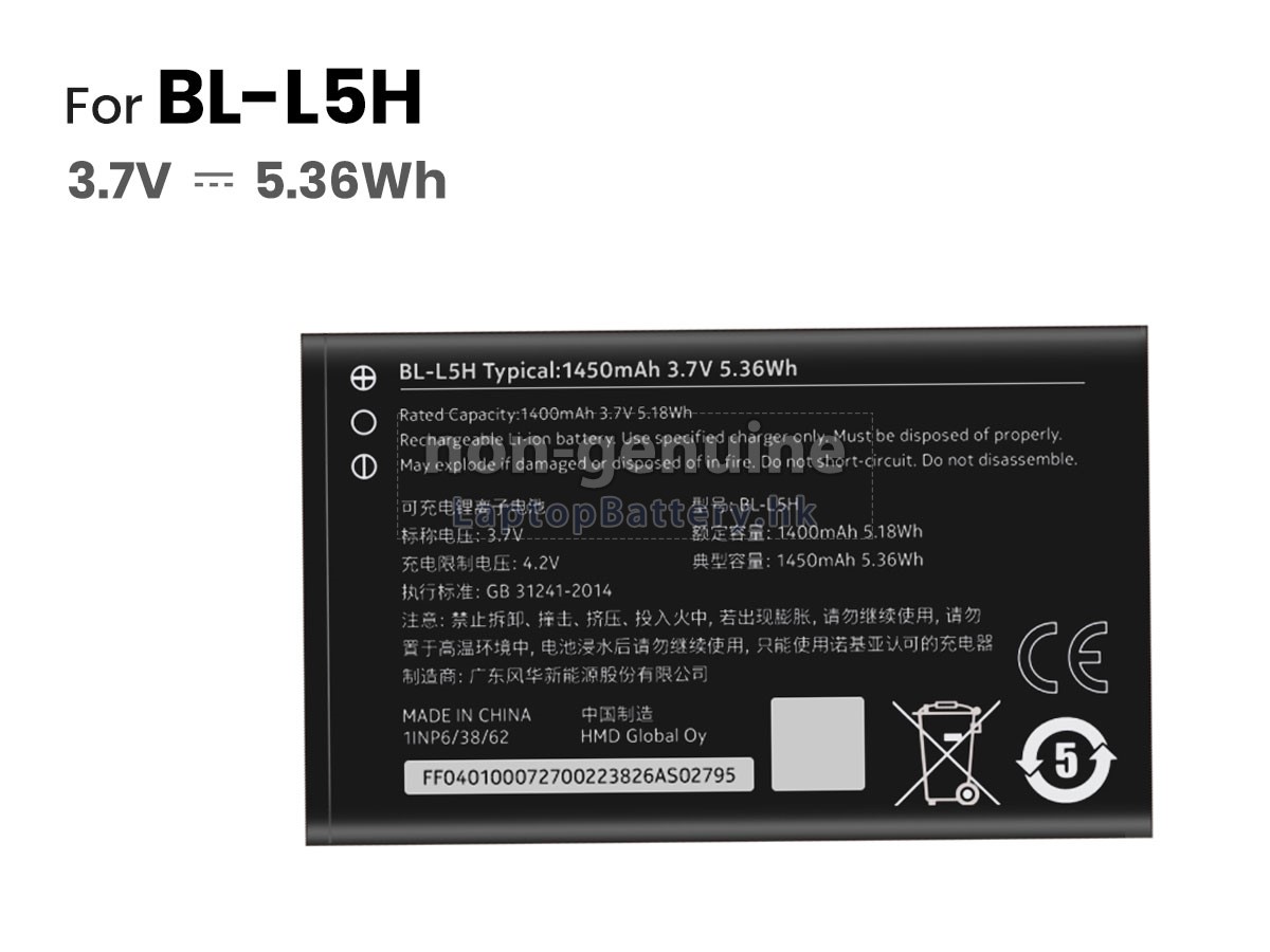 高品質NOKIA諾基亞BL-L5H替代電池 (5.36Wh,1芯)