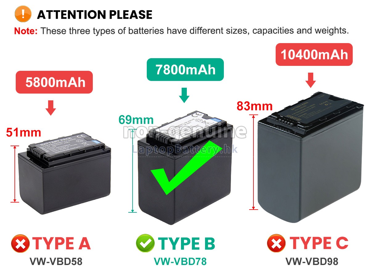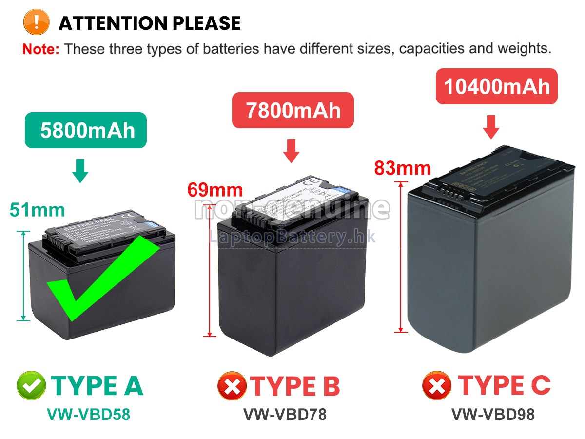 VW-VBD58/78/98 has capacity and size differences, can be compatible with the use of larger capacity battery will have a part of the battery bulge. 高品質PANASONIC松下AG-VBR59替代電池 (74.9Wh,2芯)